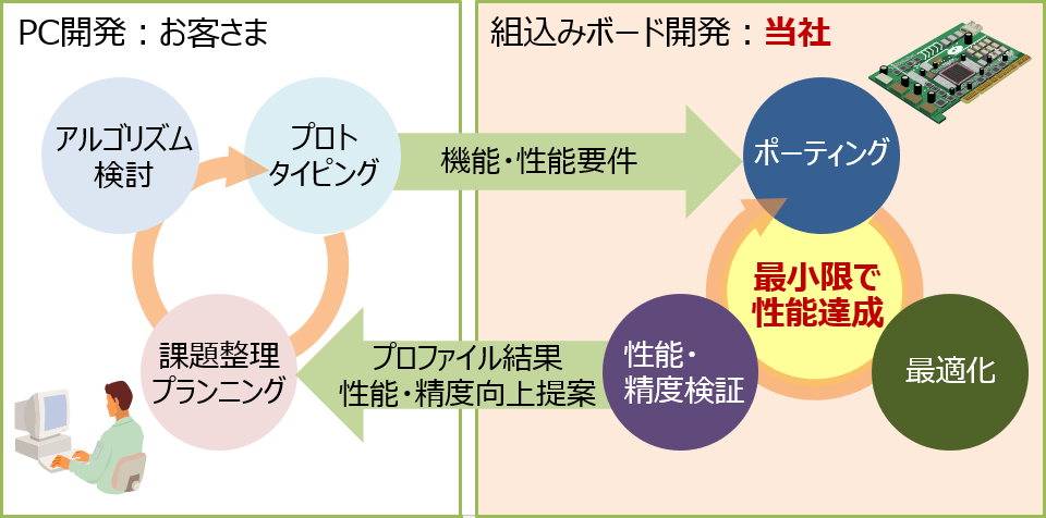 PC上で動作している小規模アプリケーションをご指定の組込みボード向けに最適化まで一括で行います。