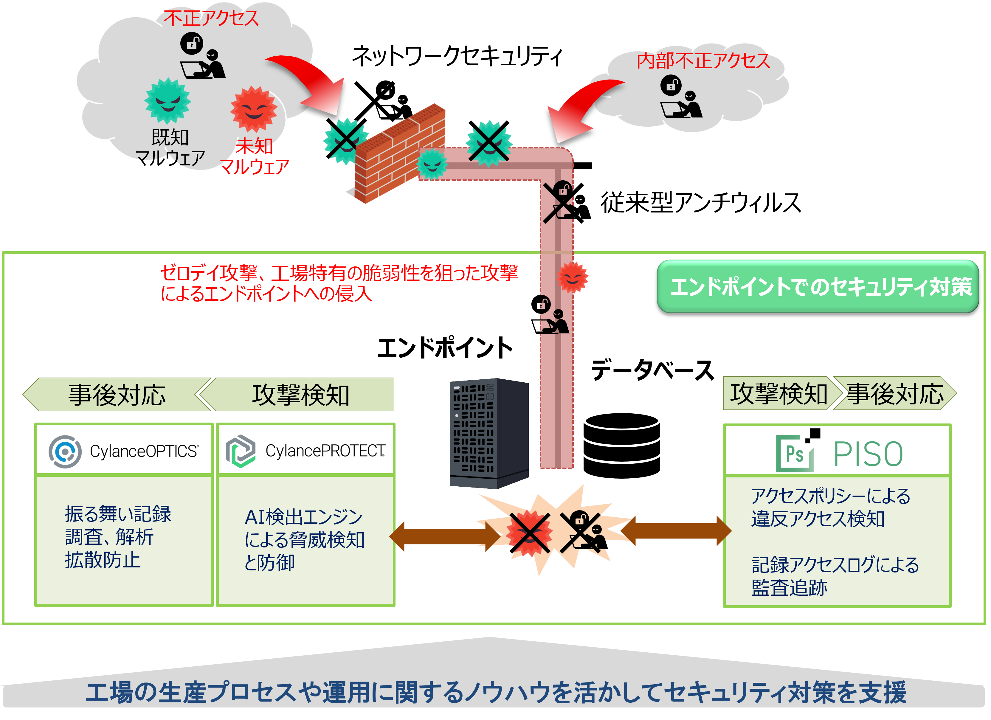 工場環境における課題を把握し、セキュリティ対策を支援。製造ラインをコントロールしている機器、工場内データを管理しているデータベースへの脅威の侵入を前提として、エンドポイントで確実に脅威を防ぐソリューションを提供します。