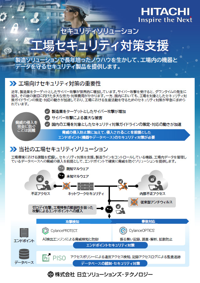 AIを利用した検索エンジンにより、既知か未知かを問わず脅威の検知が可能なマルウェア対策製品です。パターンファイルの更新が不要なため、セキュリティ管理者の負担が少なく、高い脅威検知率(99%以上)を実現します。また、レガシーOSにも対応し、システム負荷の影響が少ない軽量エージェントによって、工場環境に適したセキュリティ対策を実現できます