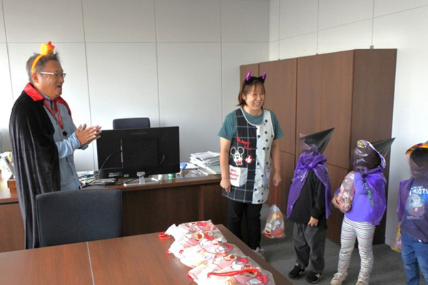 お揃いの仮装をした子どもたちは、当社社員がハロウィンイベントのために飾り付けを行ったオフィス内を巡り、「トリックオアトリート!」と元気で可愛い掛け声を合言葉に、当社社長をはじめ、プレゼンター役の社員からお菓子を受け取っていました。お菓子をもらった子どもたちはもちろん、迎えた側の社員からも笑顔があふれ、元気で明るい子どもたちの振る舞いに、社員も元気を分けてもらいました。